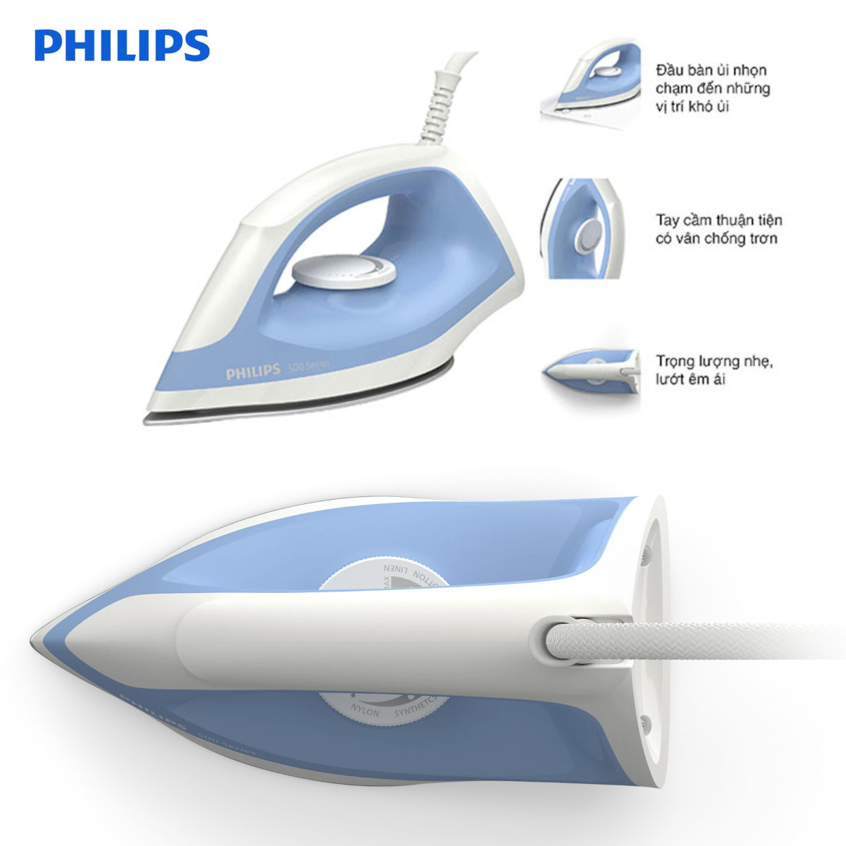 Đầu bàn ủi nhọn được thiết kế để dễ dàng ủi những vùng khó tiếp cận như cổ áo và giữa các nút.