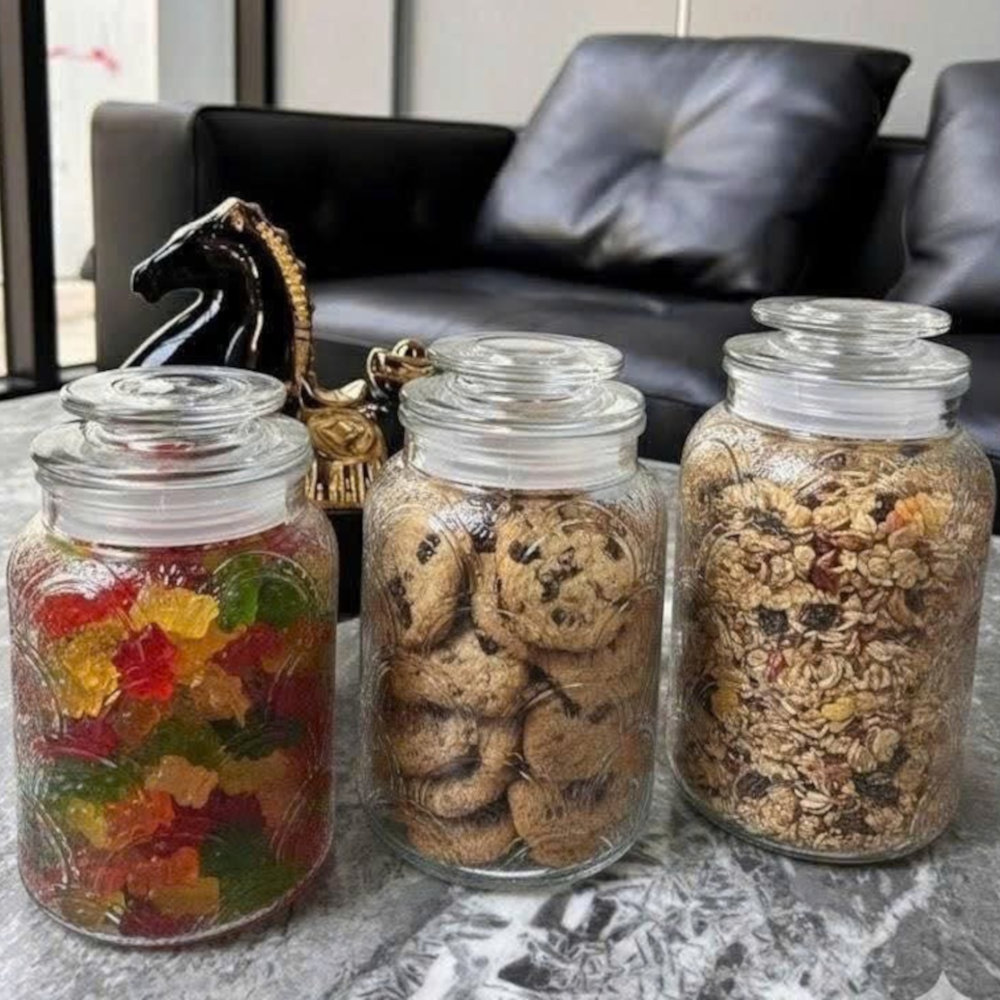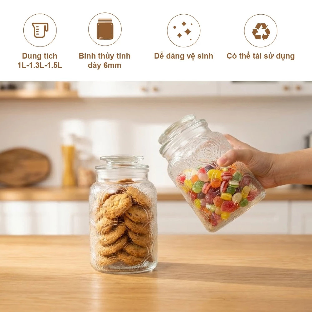 - Đa năng: Đựng bánh quy, kẹo, ngũ cốc, trái cây sấy, gia vị, đậu hạt hoặc dùng ngâm trái cây – nước detox.