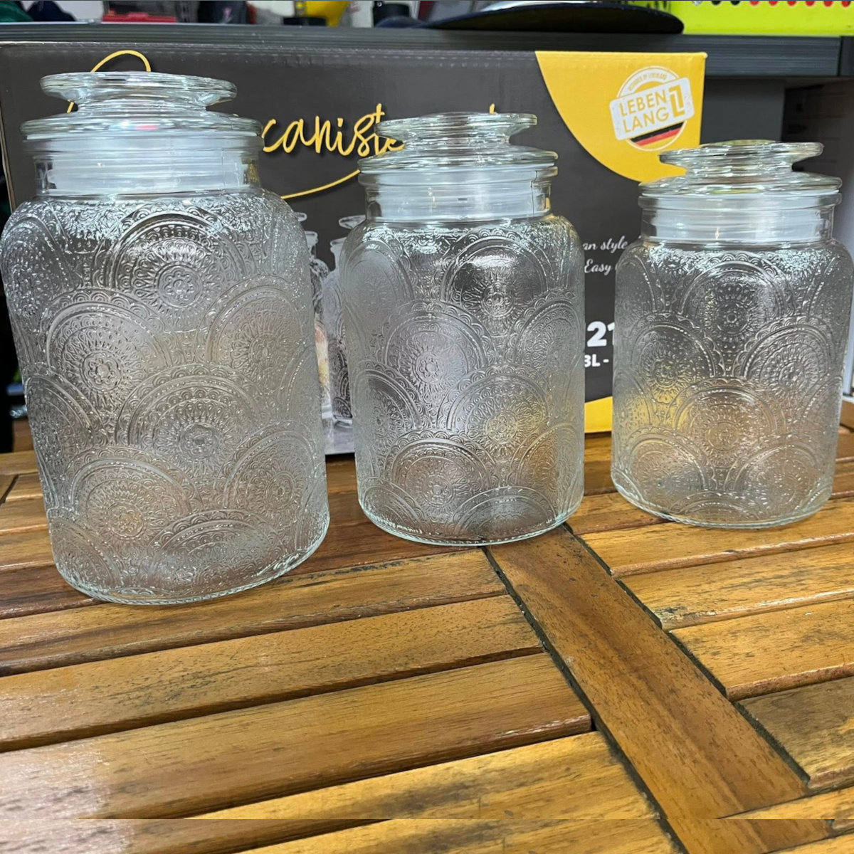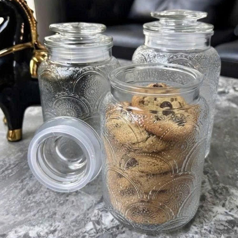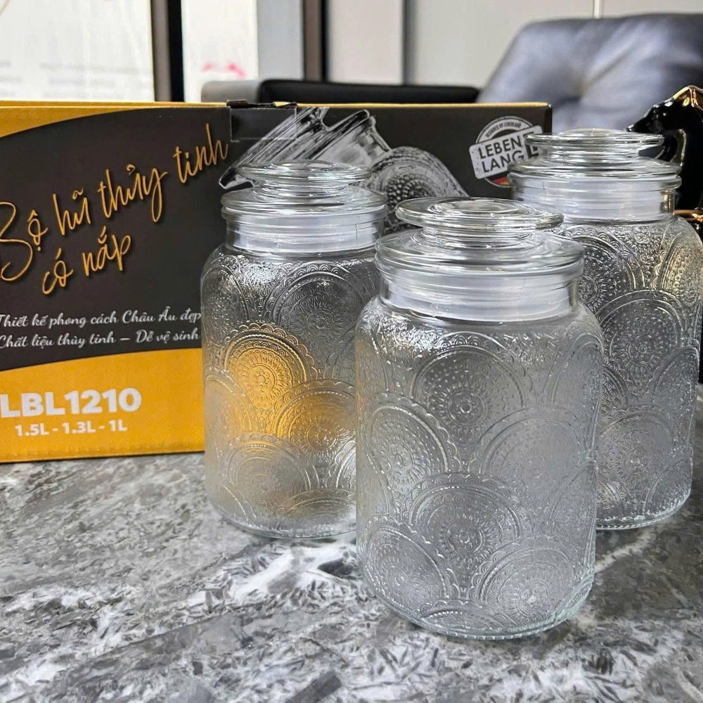 - Bộ 3 bình thủy tinh Lebenlang Thiết kế hoa văn dập nổi sang trọng, phù hợp mọi không gian: nhà bếp, phòng khách, quán cà phê, nhà hàng