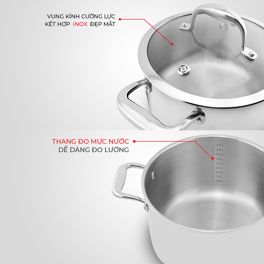 Vung kính cường lực kết hợp inox đẹp mắt: Phần kính cường lực chịu nhiệt, chịu lực dày 4mm giúp bạn dễ dàng quan sát thực phẩm khi nấu trong khi phần viền inox 304 đánh bóng gương giúp tối ưu quá trình vệ sinh, đem đến độ bền bỉ tốt hơn hẳn các loại vung khác. Lỗ thoát hơi lớn giúp chống trào hiệu quả, ngăn bắn nước và hơi nóng khi nấu.