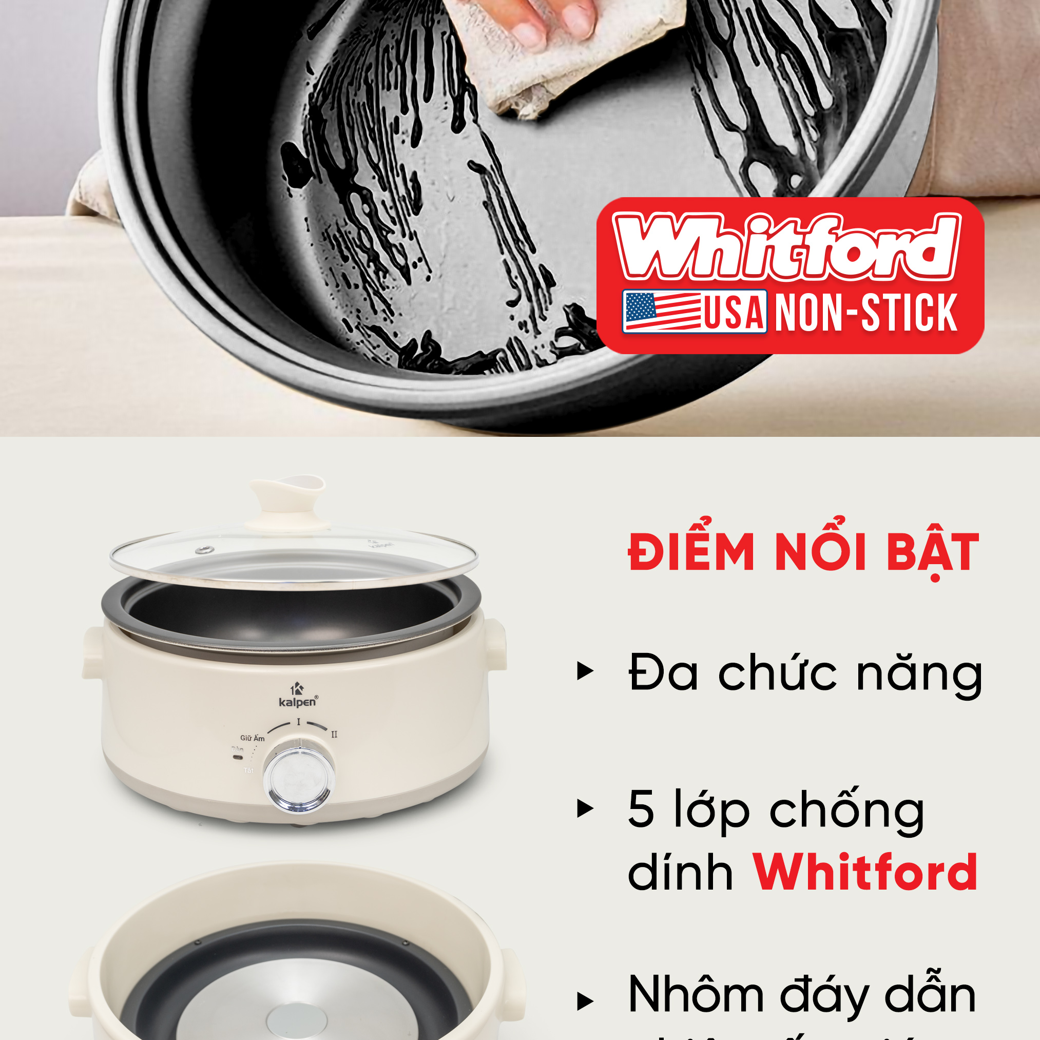 Nồi lẩu điện Kalpen 5L được phủ 5 lớp chống dính Whitford có độ dày 60µm siêu bền bỉ, có khả năng chịu sự chà sát lên đến 100.000 lần vì thế bạn hoàn toàn yên tâm về độ an toàn cho sức khỏe cũng như yên tâm về tuổi thọ của sản phẩm khi sử dụng.