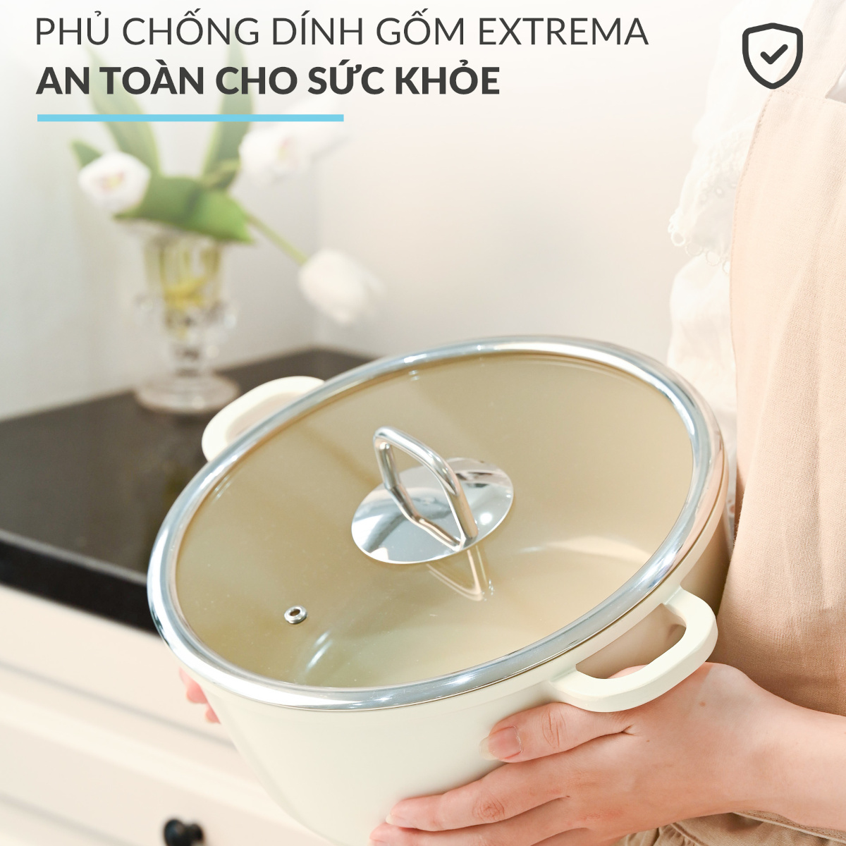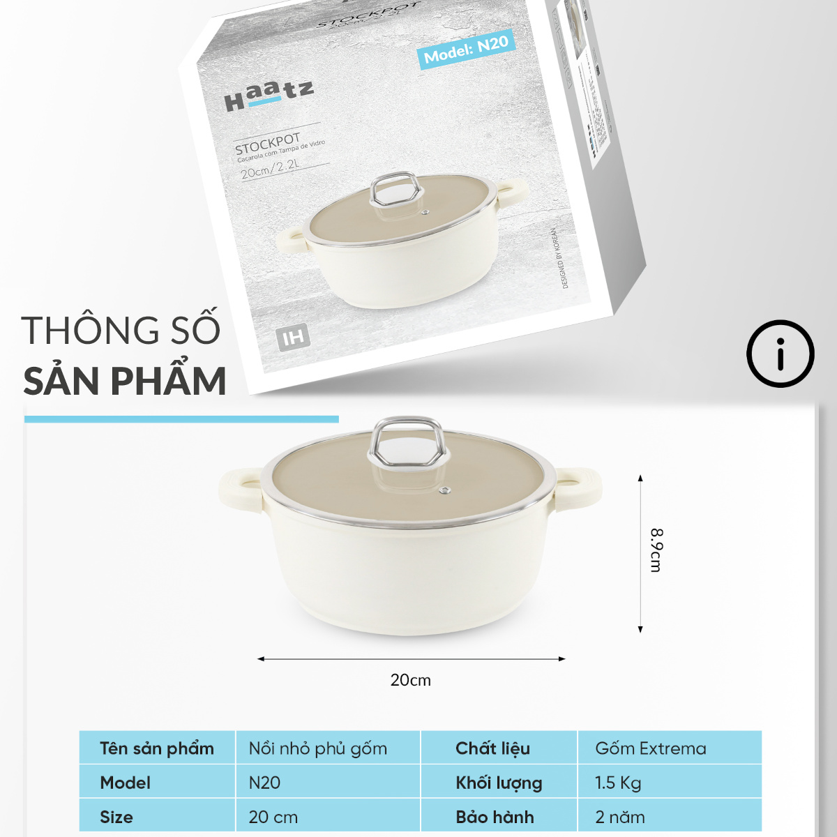 • Kích thước: 20 x 8.9cm • Màu sắc: Trắng kem • Chất liệu: Nhôm phủ gốm chống dính Xtrema • Dung tích: 2.2L • Trọng lượng: 1.125 gam